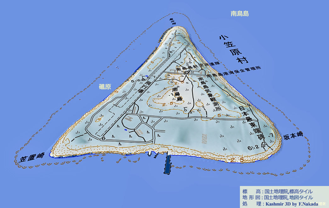 ![]() 南鳥島の周辺はリーフに囲まれています。 水深が浅いため礁湖では無く「礁源」とされているので,分類上は「卓礁」となります。 また,外周部の標高が5m~7mと高く,島の中心部が海面すれすれ,と言う特徴から,珊瑚片起源の「洲」ではないか,という説もあります。 |