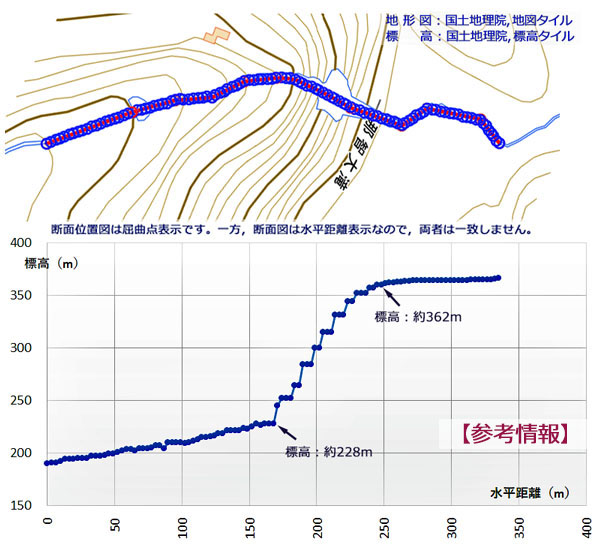 ![]() 河床縦断図は,5mDEMあるいは10mDEMを利用して推定したものです。 現場検証などを行っていないため,確定的ではありません。目安とお考えください。 |