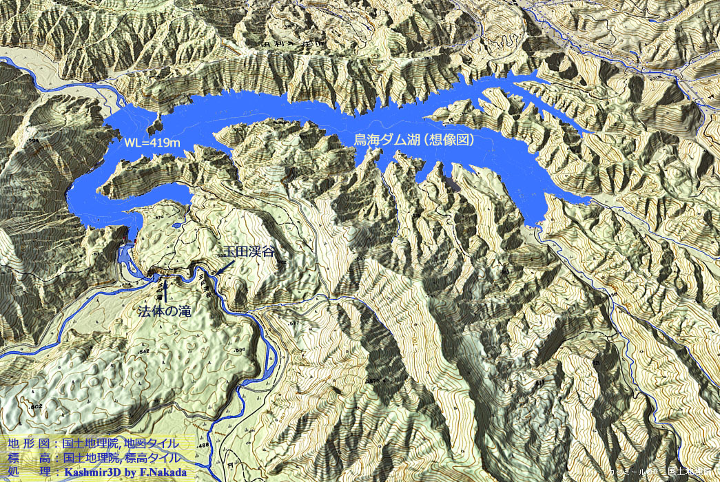 ![]() 水面を不透明にした予想図です。 満水時の「EL 419.2m」を参考にして419m以下を青色で塗りつぶしてあります。 「法体の滝」と「玉田渓谷」には,湛水の影響がないことがわかります。 注 ダムサイトの詳細な位置がわからないので,ダムサイト付近は目安とお考え下さい。 |