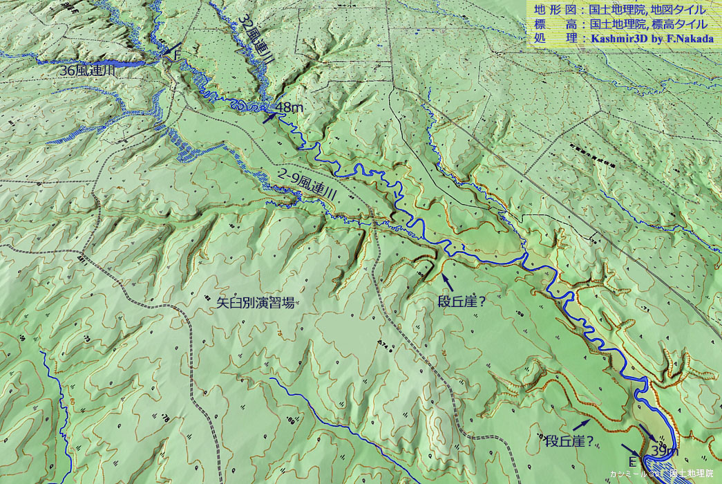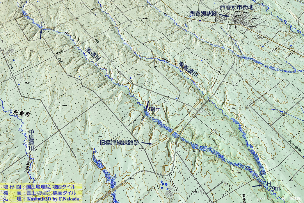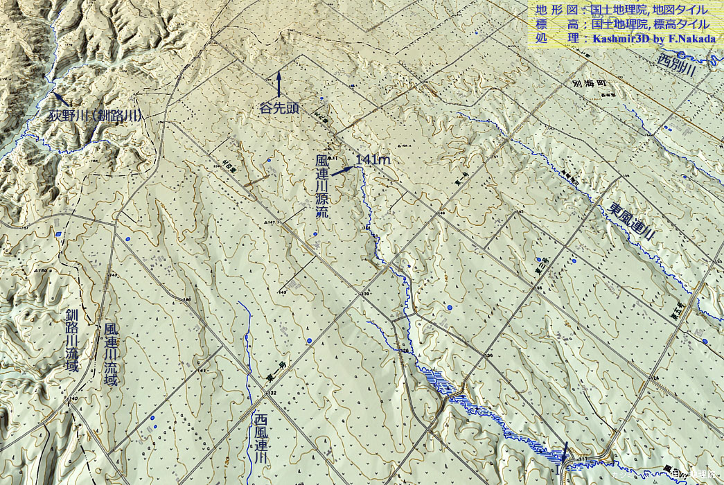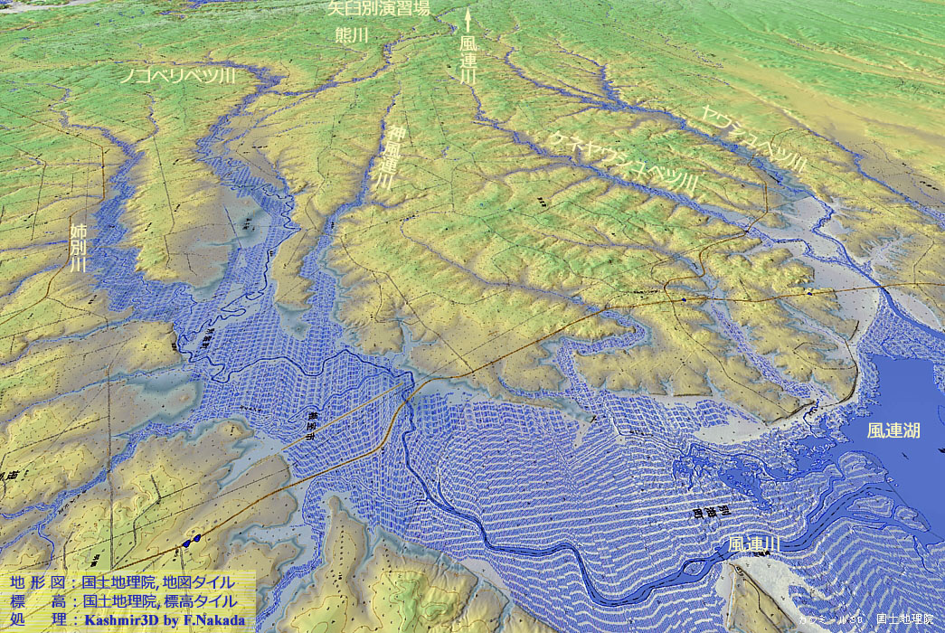 | 地形の三次元イメージ : 風蓮川,中流~下流の核心部 |