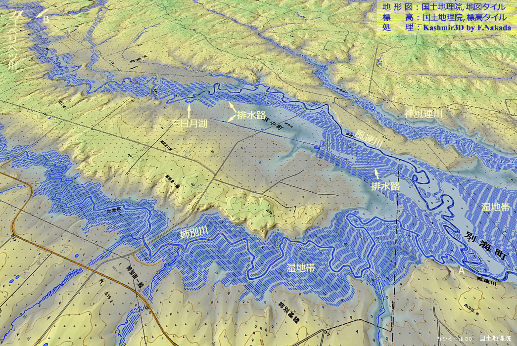 ![]() 「姉別川」と合流するあたりから「風連湖」までの間,「風連川」には広大な湿地帯が付属します。 これらの湿地帯は洪水の時に冠水するでしょうから,いわば「氾濫原」と言うことになります。 |