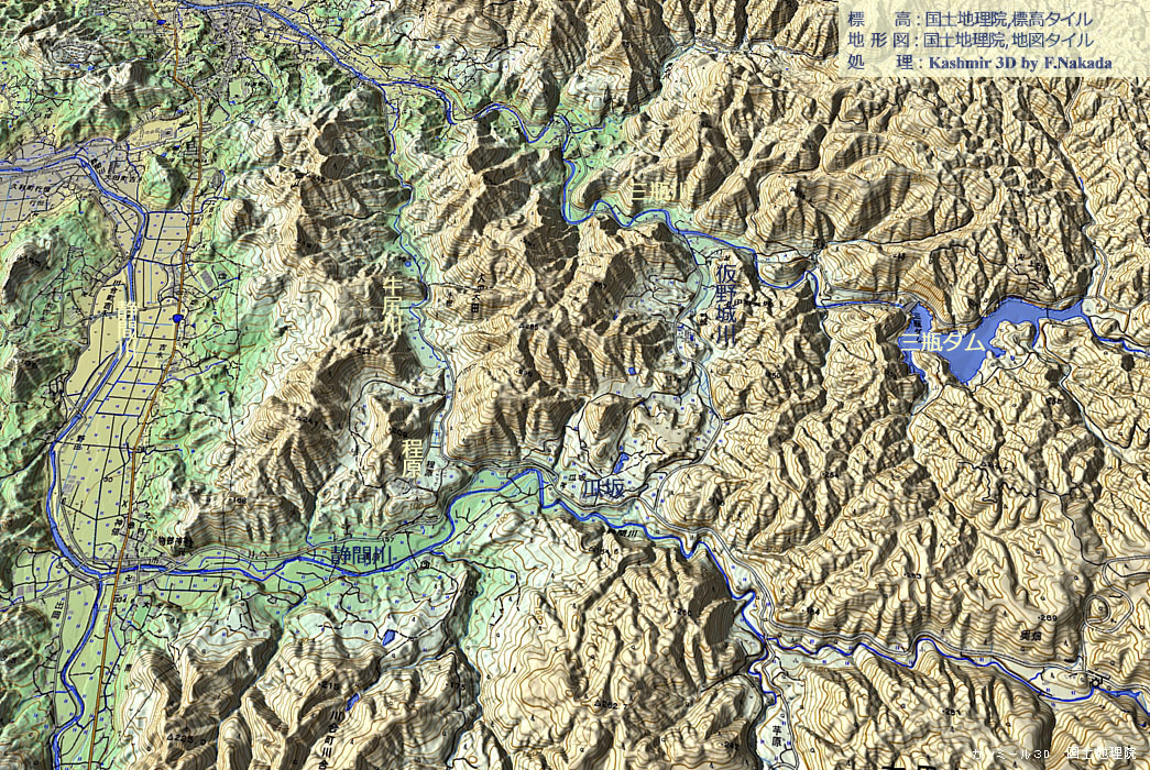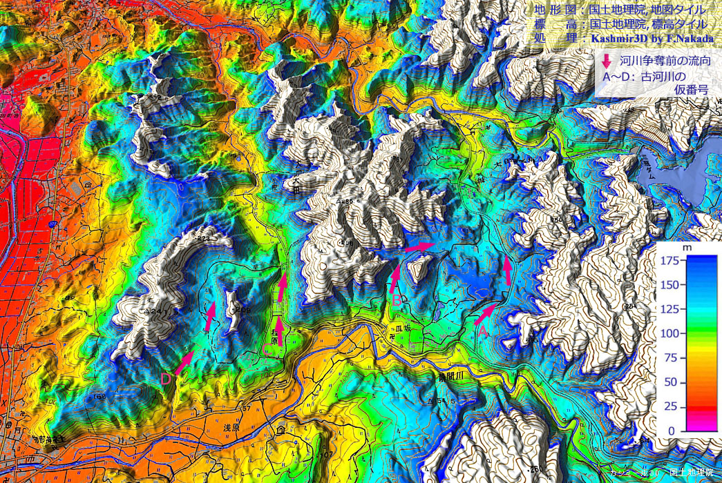 | 標高段彩図の三次元イメージと古静間川の流向 |