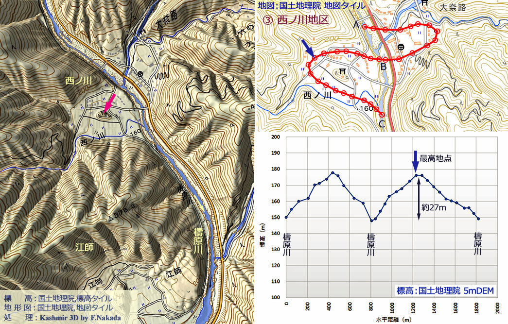 ![]() 「江師」環流の上流で背中合わせの場所にあります。 対岸にも,中央丘陵の無い「環流丘陵」が存在するため,地形断面図はひとつのものとして作成しました。 二つの環流丘陵とも,環流部の背後から流れてくる複数の川の存在が最大の特徴です。 檮原川の環流が終了して環流部が陸水化した後に,それらの川による侵食により,比較的傾斜の急な地形を呈しています。 |