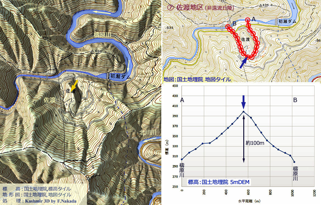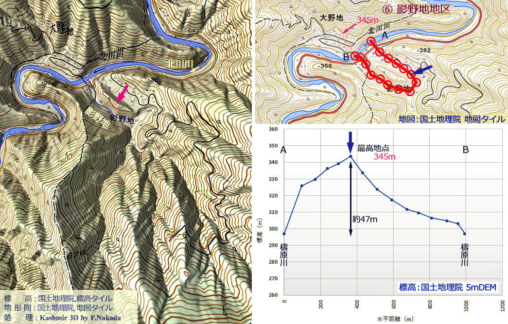 ![]() 檮原川の孫支流である「北川川」の合流点の上流,北川川と背中合わせである「環流丘陵状地形」です。 ①環流状地形の最高点と檮原川の水面との標高差が約100mあること,②環流状地形を流れる有力な川が無いこと, により,一見環流丘陵(穿入蛇行)のように見えますが,偶然の産物であろうと考えました。 |