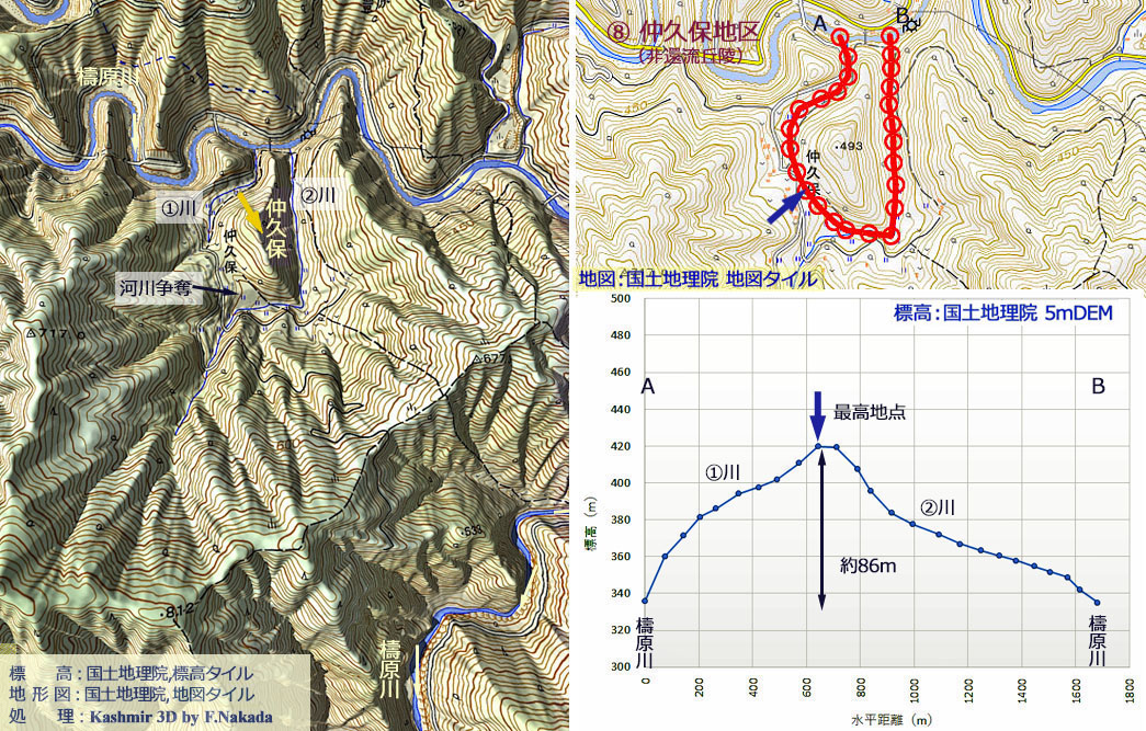 ![]() この地形は,「穿入蛇行」による「環流丘陵」では無く, 「仲久保」という地名の上流側で「河川争奪」が起きたために,環流丘陵のように見える地形であろうと考えました。 檮原川に注ぐ「①川」は,背後の尾根を源流として流れていましたが, すぐ下流の「②川」の侵食力が強大であったため,上流部を奪われてしまった,というストーリーです。 |