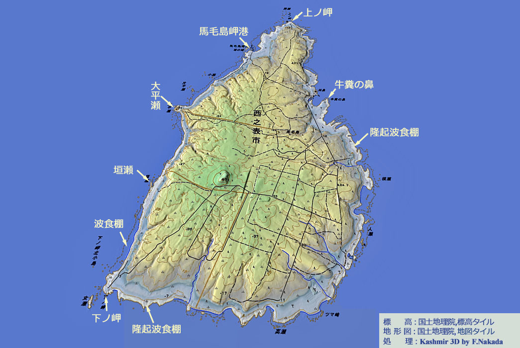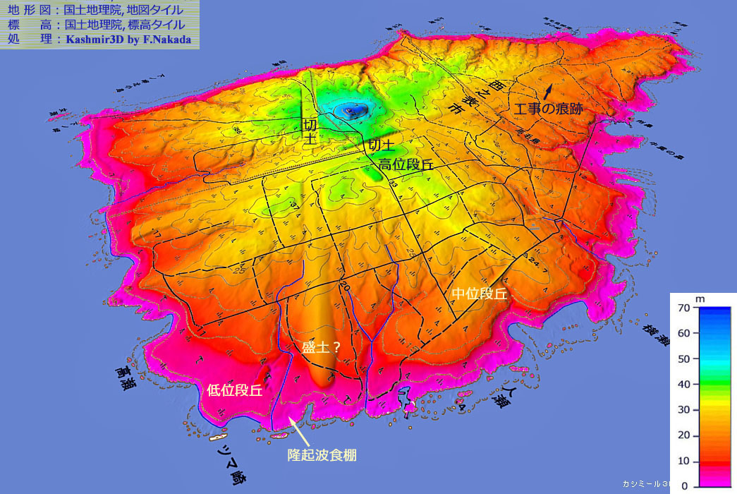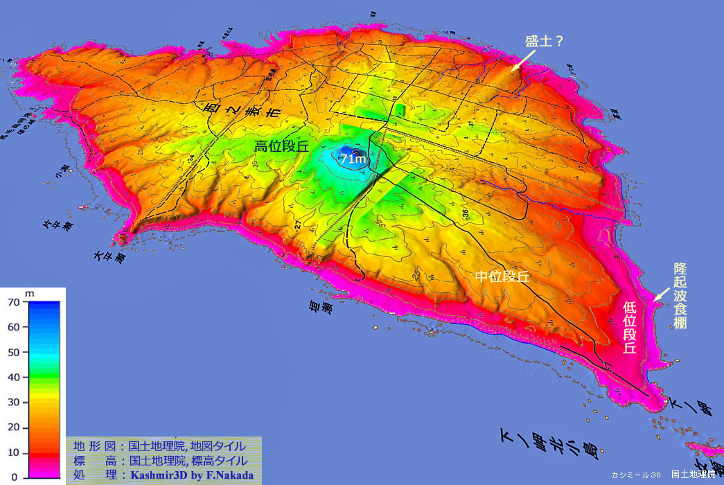 ![]() 編集部が独自に区分した「海成段丘面」は,高位・中位・低位の3区分です。 最も面積の広い区分は「高位段丘面」のようです。 「低位段丘面」は,「隆起波食棚」を含むと考えています。 また,島の周囲には随所に「波食棚」が分布していて,陸地化の予備軍となっているようです。 |