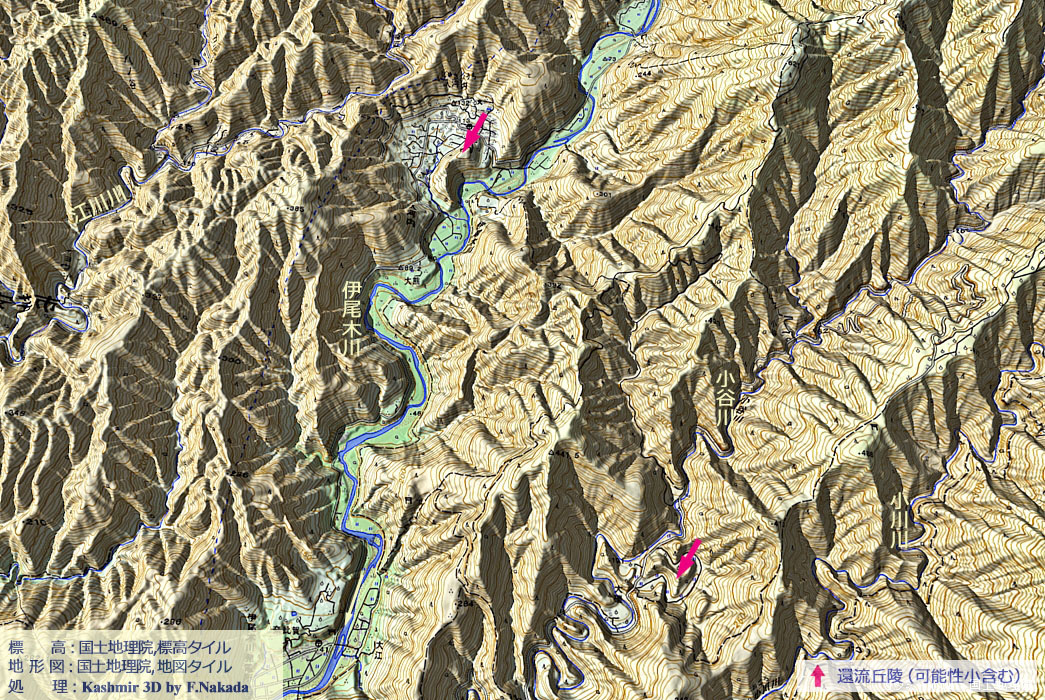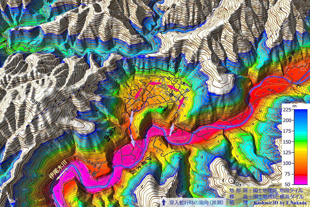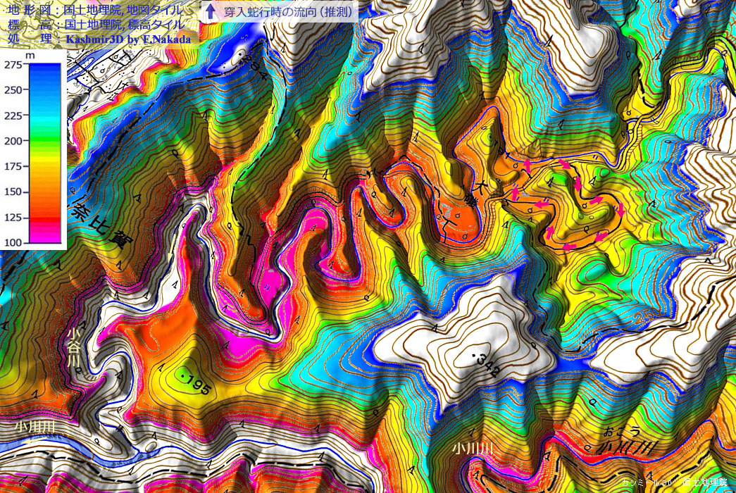 | 標高段彩図の三次元イメージ : 小谷川の環流丘陵 |