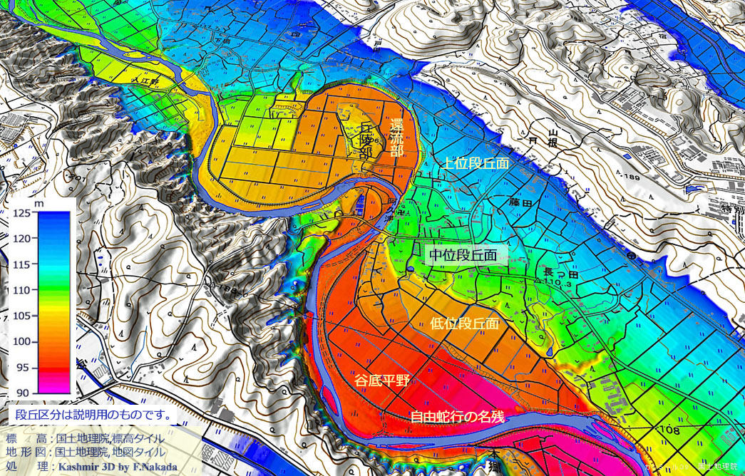 離水扇状地,段丘面,自由蛇行,蛇行切断,環流丘陵 |