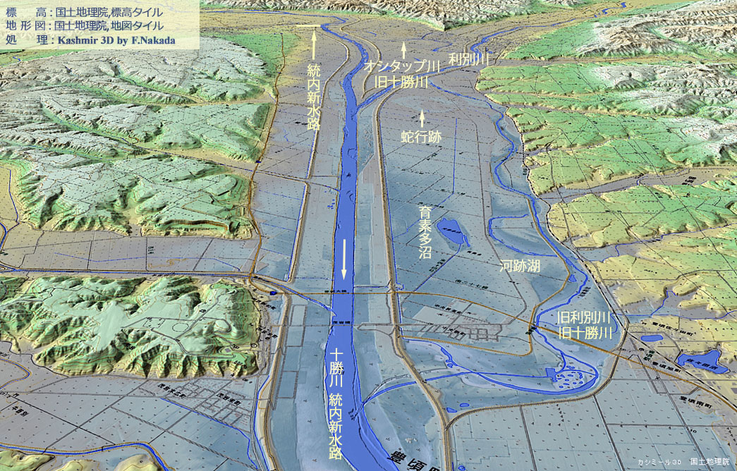 | 地形の三次元イメージ : 十勝川の河道変遷(河川改修) |