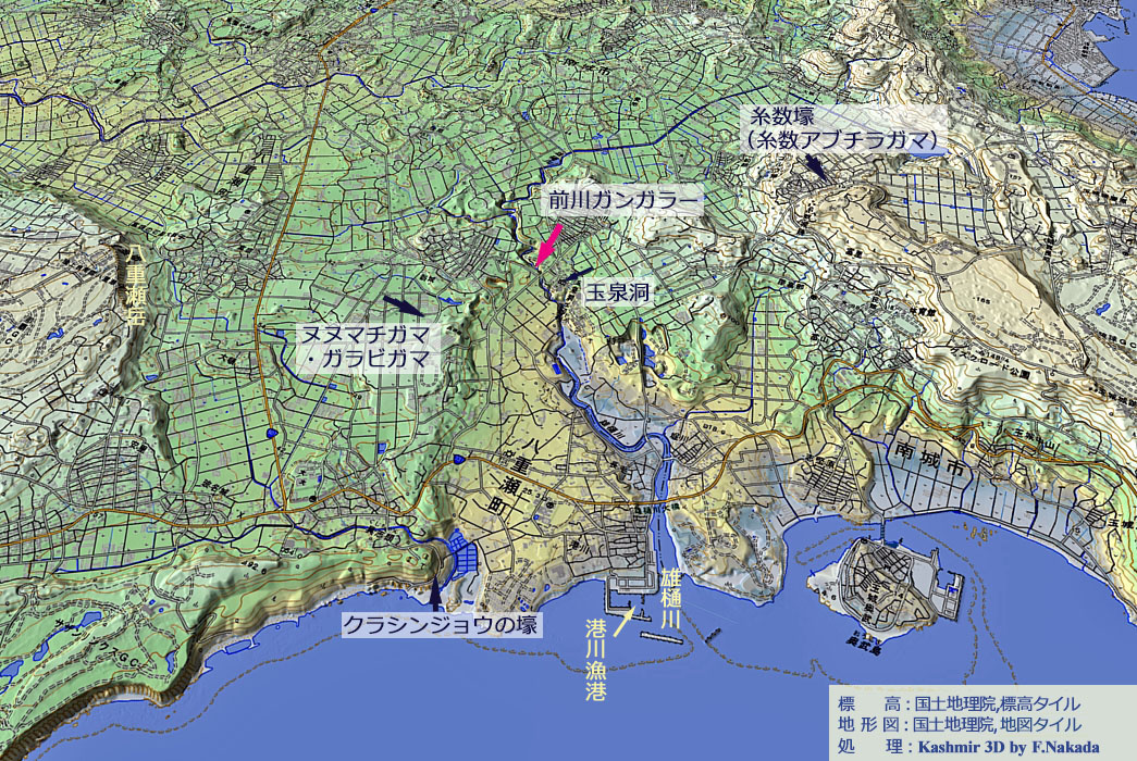 ![]() 「雄樋川」の上には道路が通っています。 地図記号をよく見ると,川の記号が途中で消えていることに気づきます。 すなわち,この部分が「暗渠」になっていることを示しているのです。 問題はこの暗渠なのです。 実は,人工的な隧道ではなく,自然の「鍾乳洞】なのです。 |