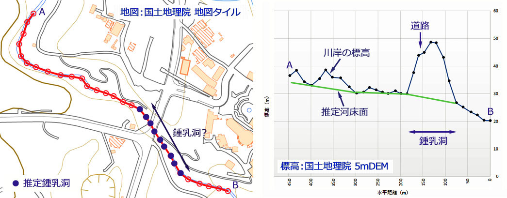 ![]() 国土地理院の5mDEMを利用して,雄樋川の河床と思われる場所の標高を推測してみました。 道路部分を含む約100mの区間が,暗渠(実は鍾乳洞)であることがわかります。 なお,川の記号に沿って標高を推定しましたが,川岸と思しき値が得られている部分があります。 |