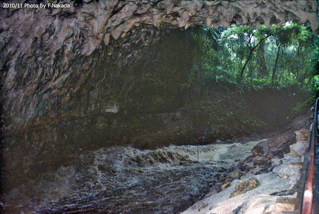 ![]() 鍾乳洞(前川ガンガラー)に突入?する「雄樋川」の川水。 折からの豪雨で,随分と水嵩が増しています。 このような濁流が,鍾乳洞を拡幅したことでしよう。 |