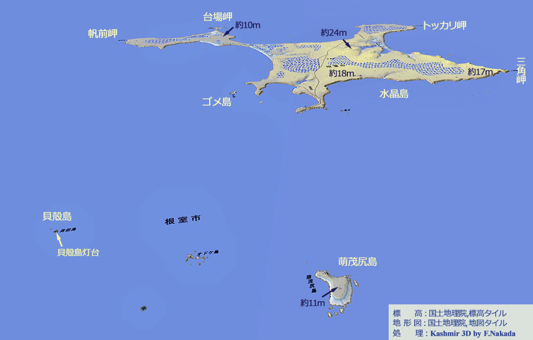 ![]() 「歯舞群島」とは,「萌茂尻島」,「水晶島」,「秋勇留島」,「勇留島」,「ハルカモシリ島」,「志発島」と「多楽島」及び周辺の岩礁のことです。 いずれも,標高が40m以下の「海成段丘(海岸段丘)」が発達し,その間に低湿地が広がっています。 一方,「色丹島」には標高が400mを超える山が存在し,海成段丘も発達していないなど,歯舞群島とは地形が全く異なっているのが最大の特徴です。 |