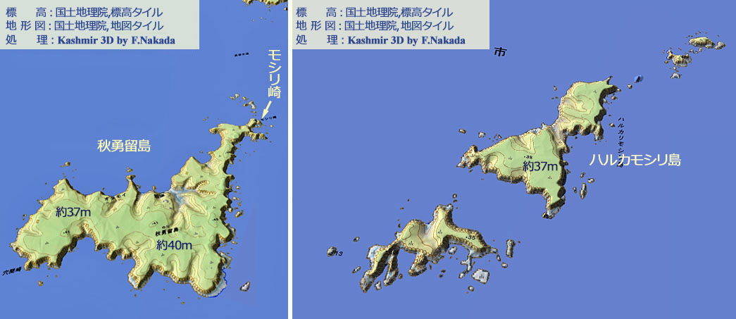 ![]() (左)秋勇留島(あきゆり島)。 (右)ハルカモシリ島。 両島とも,根室半島~歯舞群島~色丹島列線の,最も右側(南東側)に位置しています。 両島とも,標高約35m~約40mの海成段丘(海岸段丘)が発達している関係で,両島の周囲は殆どが「海食崖」となっています。 産総研の1/20万シームレス地質図によると,新生代古第三紀以後の安山岩(質)の溶岩・火砕岩で構成されています。 |