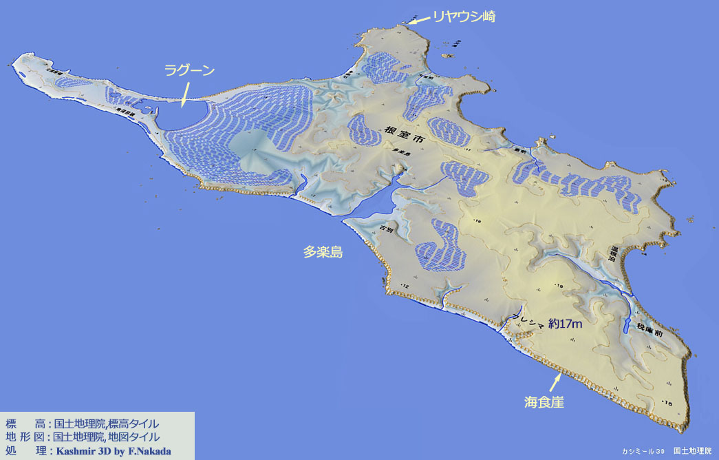 ![]() 多楽島(たらく島): 歯舞群島最北端の島です。 島の東側の大半には,標高約17mの(仮)中位段丘面が広がっています。 一方,西側には「砂州,」「ラグーン」やそれ由来と思われる湿地が分布しています。 産総研の1/20万シームレス地質図によると,中生代後期白亜紀の海成砂岩と,同時期の玄武岩が層状に分布しています。 |