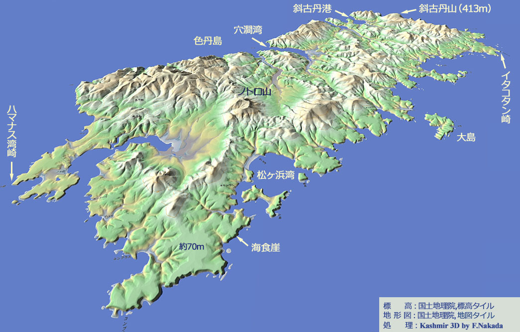 ![]() 志発島(しぼつ島) : 島の東側は標高約25mの(仮)中位段丘面が広がっていて,海岸は「海食棚」となっています。 一方,島の西側は全般的に標高が低く,広大な湿地帯が面積の大半を占めています。 産総研の1/20万シームレス地質図によると,中生代後期白亜紀の海成砂岩が卓越し,部分的に同時期の玄武岩が点在しています。 |