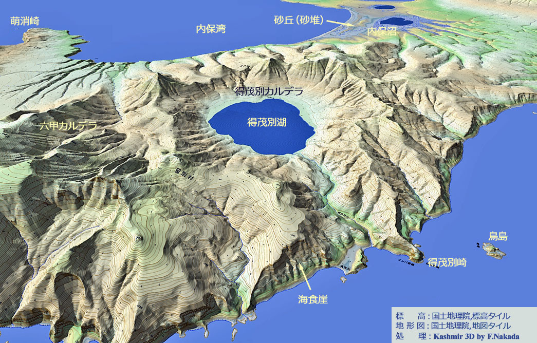 ![]() カルデラである「萌消湾」の反対側にも,カルデラ湖を伴うやや小ぶりのカルデラが存在します。 直径が約6kmの「得茂別(うるもんべつ)火山」と言い,主な活動期は,新生代第四紀中期更新世(約50万年前頃)です。 得茂別カルデラの南西側には,より時代が古い「六甲カルデラ」がありますが,北東半分ほどが得茂別火山に覆われています。 |
