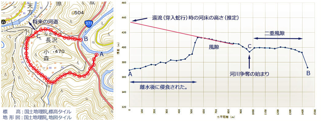 ![]() 「蛇行切断(離水)」してから相当の時間が経過していると見え,環流部分の上流部は「蓑の谷」によって浸食されてしまいました。 |