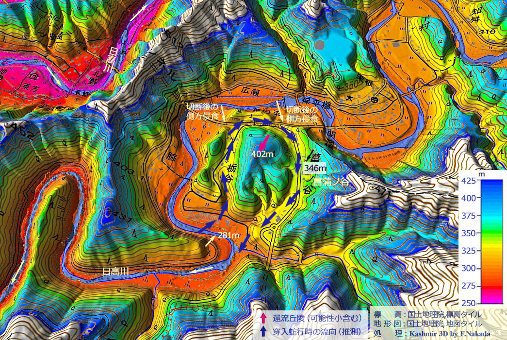 | 標高段彩図の三次元イメージと環流時の推定流向 : 寒川流域 |
