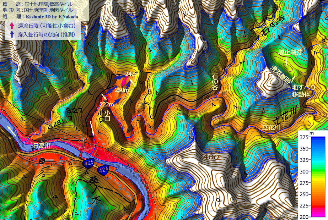 | 標高段彩図の三次元イメージと環流時の推定流向 :立花川流域 |