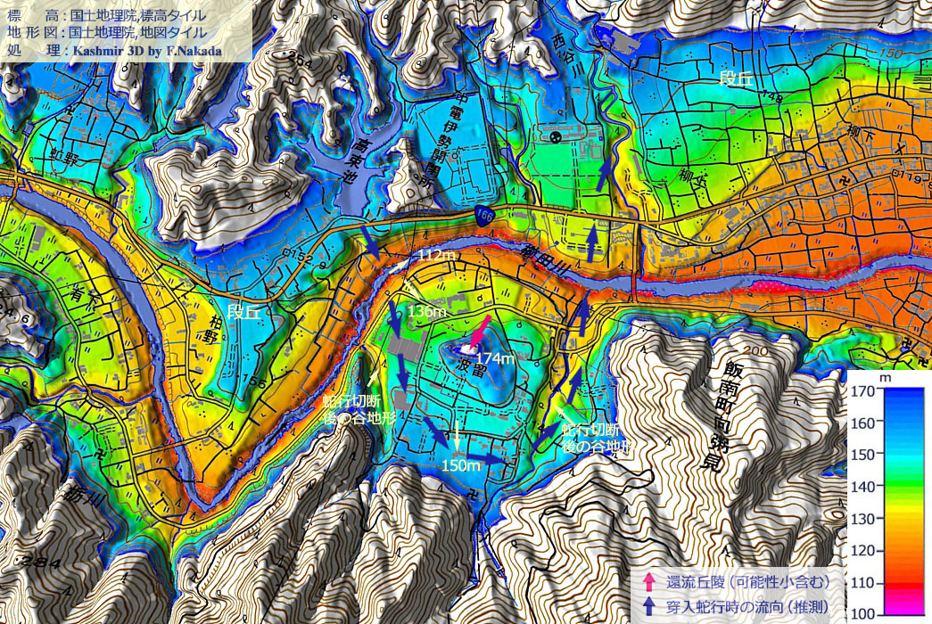 ![]() 「波多瀬地区」の「環流丘陵」は,背後から流れ下る未詳枝谷による「扇状地」が発達しています。 もちろん,その成立は「蛇行切断」後のことと思われます。 現河床の標高と旧環流部の標高差からみて,この環流丘陵の方が「波留地区」のそれよりも,地質年代的には新しいと思われます。 |
