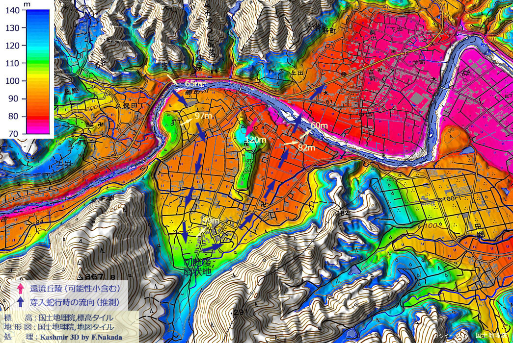 | 標高段彩図の三次元イメージと環流時の推定流向 : 波多瀬地区の三角状環流丘陵 |