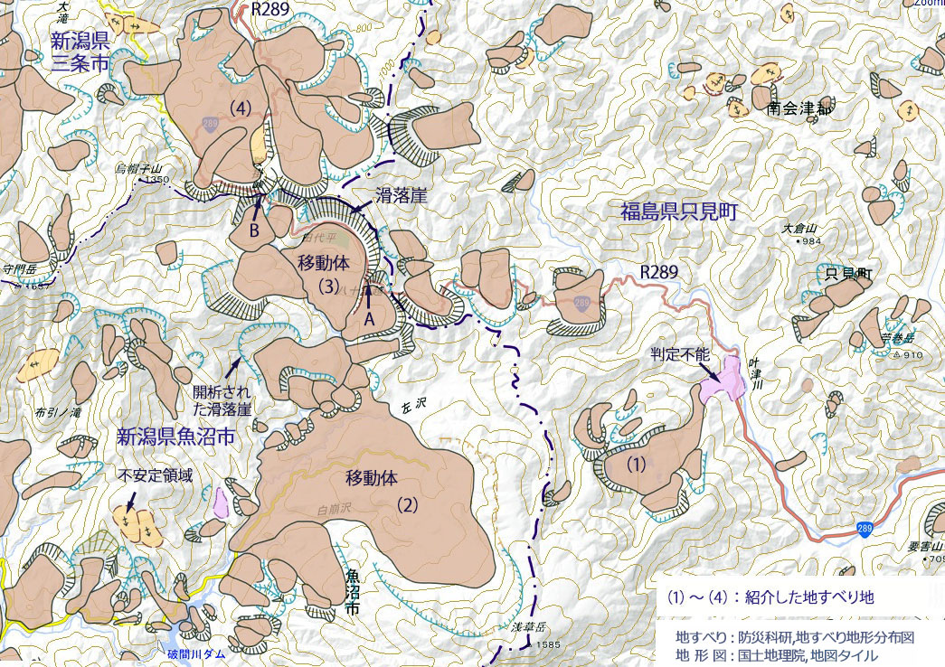 ![]() (国研)防災科学技術研究所(防災科研)の「地すべり地形分布図」によると,「八十里越」に影響を与える「地すべり地」は圧倒的に新潟県側にあります。 詳しい情報や凡例については,ここへアクセスしてください。 |