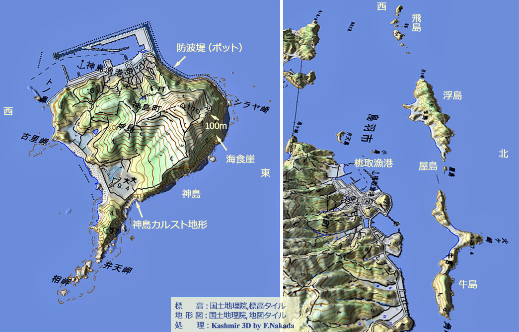 ![]() (左)伊良湖水道のほぼ中央に位置する「神島」は,他の島々と異なって「御荷鉾帯」が存在しません。 東側は太平洋に面しているためか,高さ100m程の「海食崖」が存在します。 (右)「牛島」と「浮島」などは,「答志島」の北西側の海上に,10以上の小島が数珠玉のように繋がっています。 その方向は,答志島の長径方向とほぼ並行となっており,元々は一つの尾根だったろう,と容易に想像できます。 |