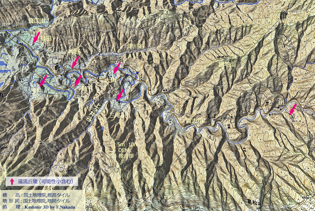 ‼マウスオーバー‼ 地図上にマウスを乗せてください。産総研・地質調査総合センターの「1/20万 シームレス地質図(出典,下記)」を表示します。![]() 紀ノ川」の有力な支流である「貴志川」は,「中央構造線」の南側に広く分布する「三波川変成帯」の中を西側に向かって流れています。 数千万年前以前に形成された古い変成岩(結晶片岩)であるためか,侵食や開析が進んでおり,多くの「穿入蛇行」と「環流丘陵」が存在します。 上図に示した「赤矢印」は,環流丘陵であることがほぼ確実な地形,あるいは確実性がやや劣ると思われる地形です。 |