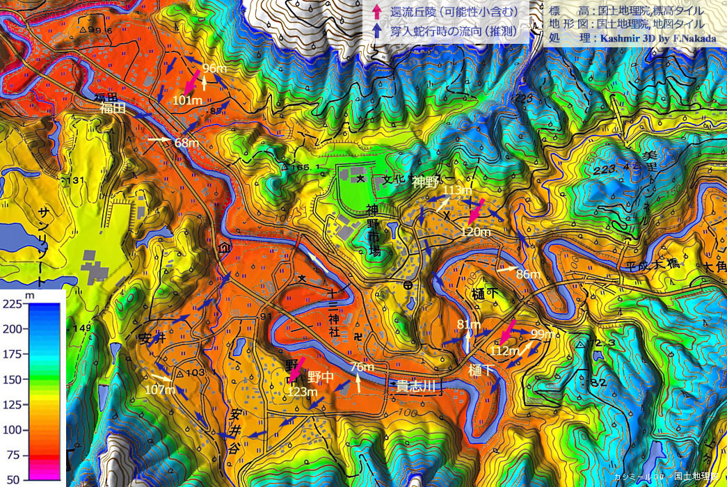 ![]() 7箇所の「環流丘陵(想定含む)」の内,最下流側の4箇所を拡大表示しました。 「青矢印」は,環流時における川水の流れ(流路)を想像したものです。 「野中地区」の想定・環流丘陵の範囲で,標高100m前後は全て「段丘」です。 これを作ったのが,当時の「貴志川」であろうと考えました。 |
