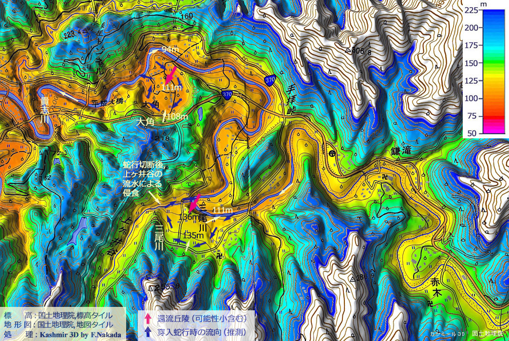 ![]() 地形図に記載されている「手拝峠」の部分は,幅の狭い尾根になっています。 豪雨時の増水があると,川水が尾根に衝突する営力(側方侵食)によって,尾根は次第に削られます。 やがて,下流側と繋がると「蛇行切断」となるので,「三尾川地区」へ流れる川水は無くなり,大きな「環流丘陵」ができることでしょう。 |