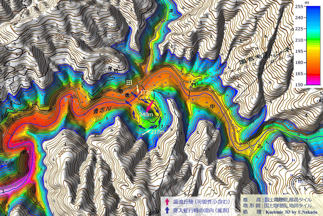 ![]() 「貴志川」沿いの「田地区」の対岸(左岸)には,きれいな「環流丘陵」が存在します。 現在の河床標高約172mに対し,環流部(段丘)の標高は約217mもあります。 標高差(比高)が45m超と大きいので,かなり古い年代に流路の切断(短絡)が起こったものと考えられます。 |