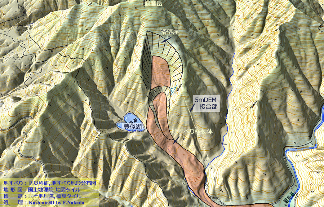 ![]() 「豊似湖」は,天然のダム湖です。 観音岳の北東斜面で発生した地すべり(深層崩壊かも?)の移動体が川を堰き止め,現在に至っていると考えられています。 地すべり自体は,「花崗閃緑岩類」の斜面で発生したようです。 |