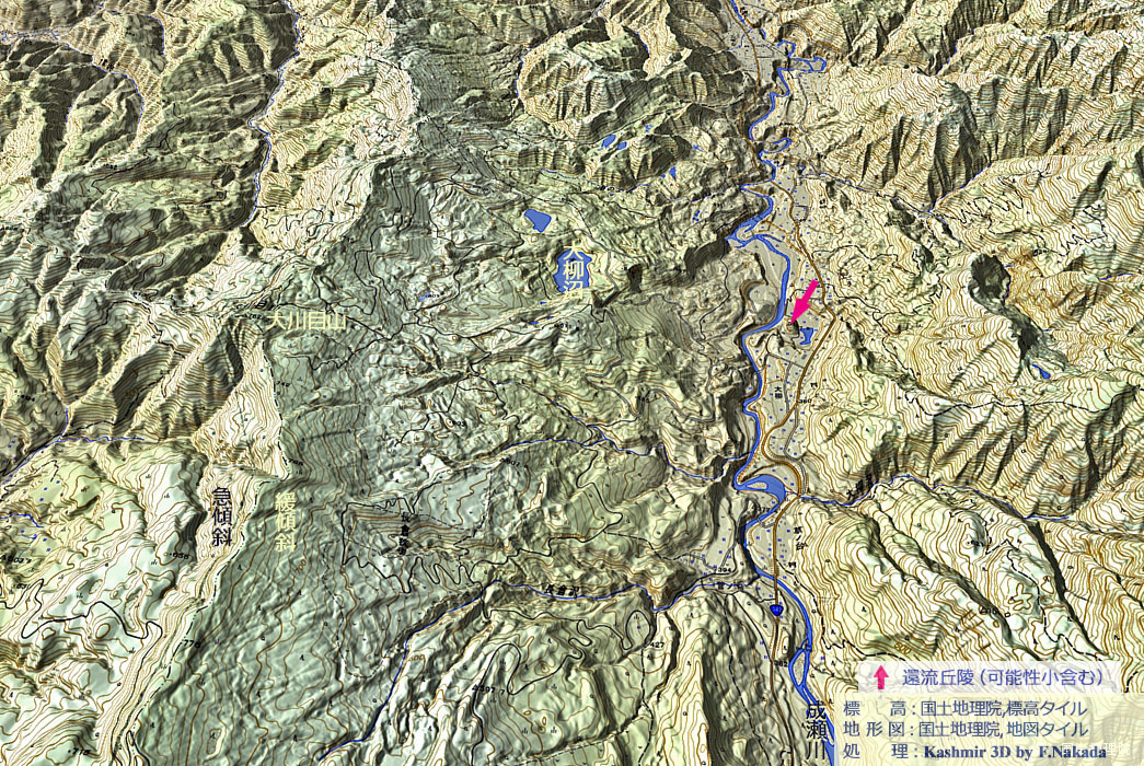 ![]() 「成瀬川」の右岸側に,小規模の「環流丘陵」が存在します。 地すべり地形分布図では,中央丘陵の位置まで「地すべり移動体」の印があるので,この丘陵は「流れ山」かもしれません。 左岸側にも同じような地形がありますが,人工的に改変されているために,よくわかりません。 なお,右岸側に幅の狭い「凹地(線状凹地)」が存在します。 かつて,古成瀬川が流れた跡,とも考えられますが,こちらもよくわかりません。 |