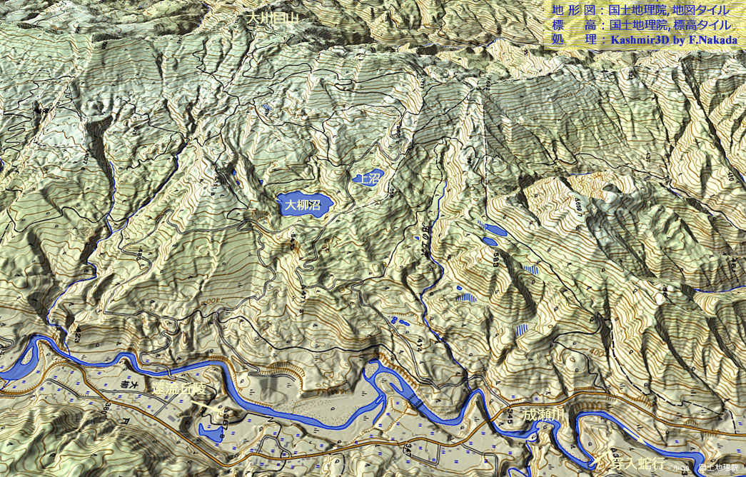 ‼マウスオーバー‼ 地図上にマウスを乗せてください。防災科学技術研究所の「地すべり地形分布図(出典,下記)」を表示します。![]() 「谷地地すべり地域」の「冠頂部」は,「大川目山」の山頂や尾根の東側直下です。 一方,じすべりの「尖端部」は「成瀬川」の河畔に達すると言う,実に広大な範囲が地すべりの範囲となっています。 森屋ほか(2012)は,今から20万年前以上前から始まったのではないか,と論じています。 東斜面にある「大柳沼」や「上沼」,小規模の湿地などは,地すべり移動体(土砂)が移動する際にできた「凹地(窪地)」に,雨水や地下水が溜ったものです。 |