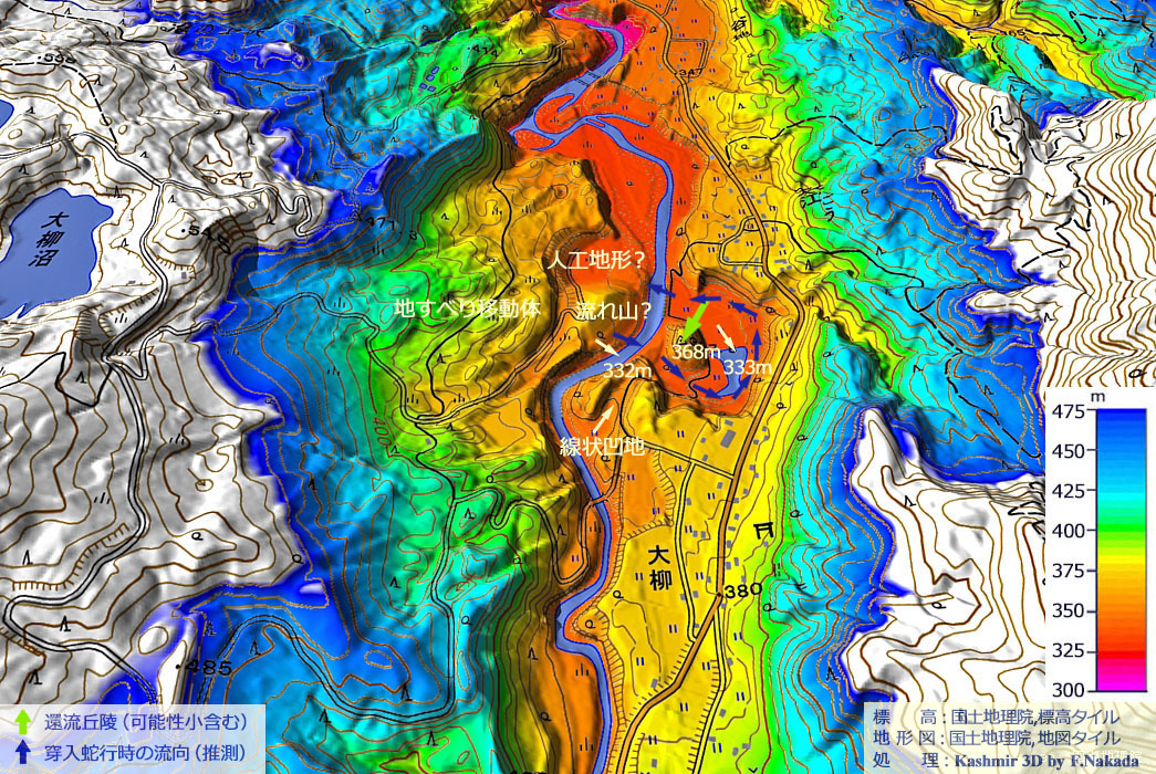 地すべり地形,移動体,地すべり性凹地,環流丘陵,蛇行切断 |