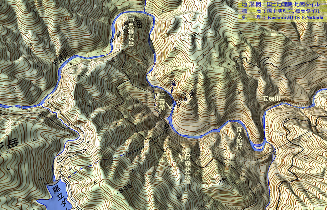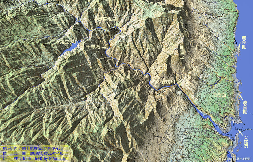 | 地形の三次元イメージ : 安房川(あんぼうがわ)と千尋の滝(せんぴろたき) |