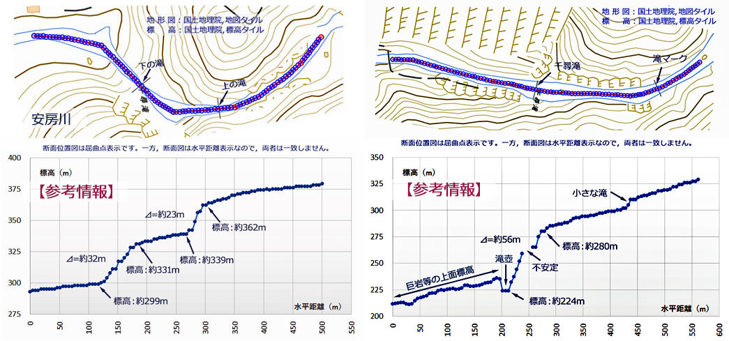 ![]() 「鯛ノ川」にある「千尋滝」の河床断面図には「滝壺」が存在しています。 一方,空中写真で確認した所,滝壺の下流側の河床には数多くの巨岩が折り重なっており,水流はその隙間をすり抜けて流れている,ことがわかりました。 以上のことから,標高約224mは滝壺の水面の標高であろうと推測しています。 河床縦断図は,5mDEMあるいは10mDEMを利用して推定したものです。 現場検証などを行っていないため,確定的ではありません。目安とお考えください。 |