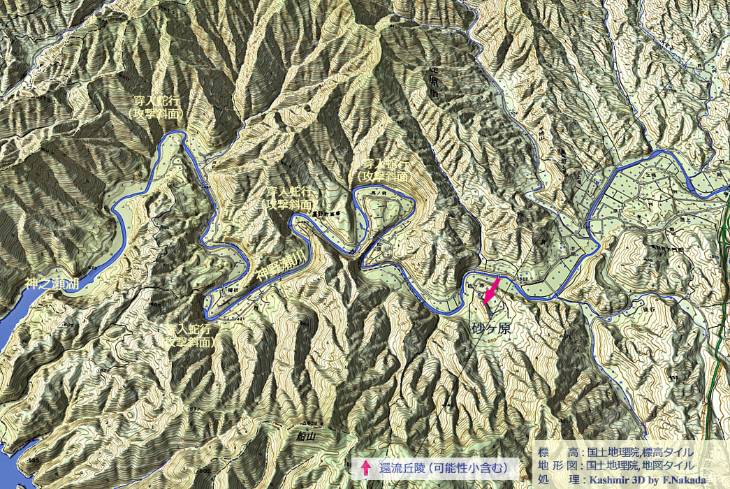 ![]() お結び型の「頭部」と幅の狭い「首」から構成されていて,地質学的な時代でまもなく「環流丘陵」となる運命の「穿入蛇行」が,ひときわ目を引きます。 |
