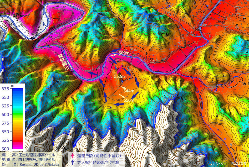 ![]() かつての蛇行部(環流部)は,恐らく「平底地形」だったと想像しますが,現在は裏山から中央環流に向かって緩傾斜が続いています。 裏山側は,恐らく「崖錐堆積物」によって埋め尽くされているのだと思われます。 かつての古河道の標高は530m付近と想像しますが,調査で確かめたわけではありません。 |