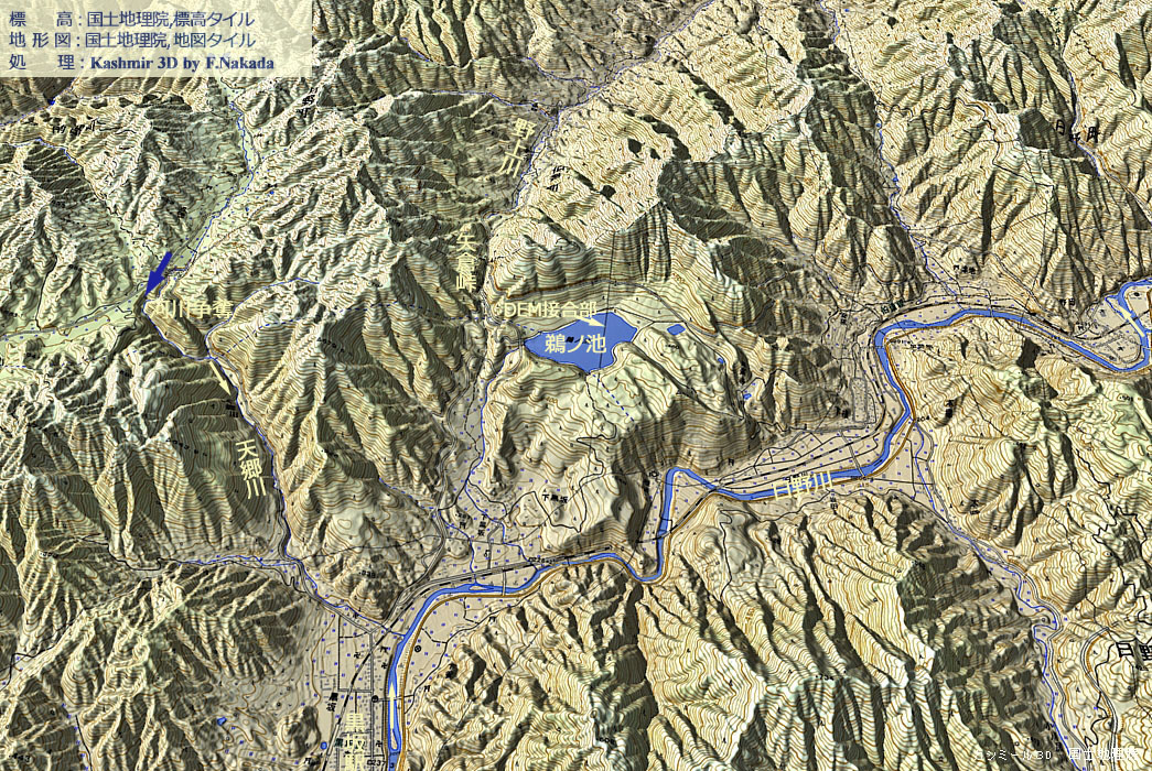| 地形と地すべり地形分布図の三次元イメージ : 鵜ノ池とその周辺台地 |