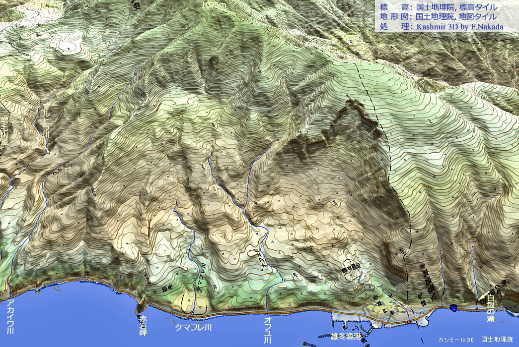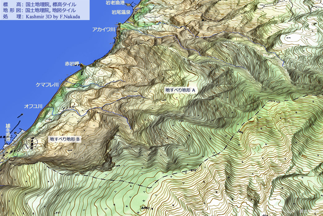 | 地形の三次元イメージ : 雄冬漁港背後の巨大地すべり地形 |