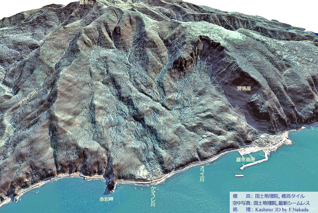 | 空中写真の三次元イメージ : 雄冬漁港背後の巨大地すべり地形 |