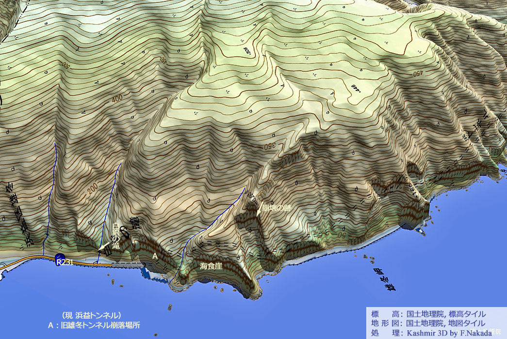 | 地形の三次元イメージ : 旧雄冬トンネル崩落事故現場付近 |