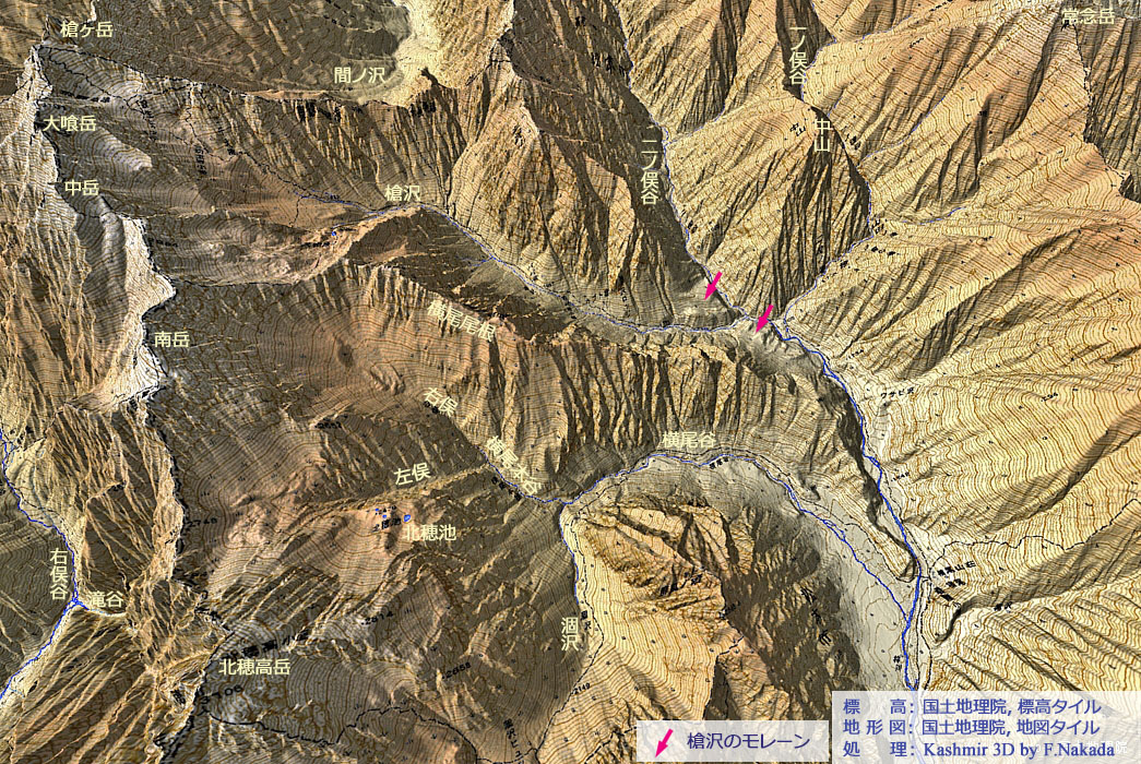 ![]() 「五百沢(1968)」の著書によると,モレーンは「①槍沢と二ノ俣谷とが出合う場所の槍沢左岸」と, 「②槍沢・二ノ俣谷・一ノ俣谷が出合う場所の槍沢右岸」の2箇所であると,記されています。 何れも,地形的には「河成段丘面」で,支谷の一ノ俣谷や二ノ俣谷には存在しない地形のようです。 |