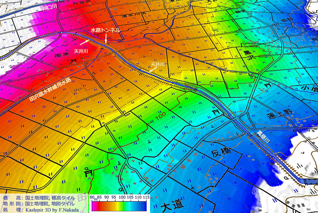 | 標高段彩図の三次元イメージ : 真昼川の天井川区間(部分) |