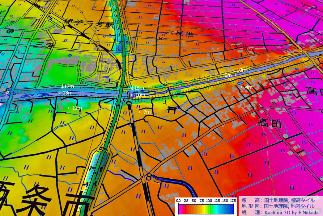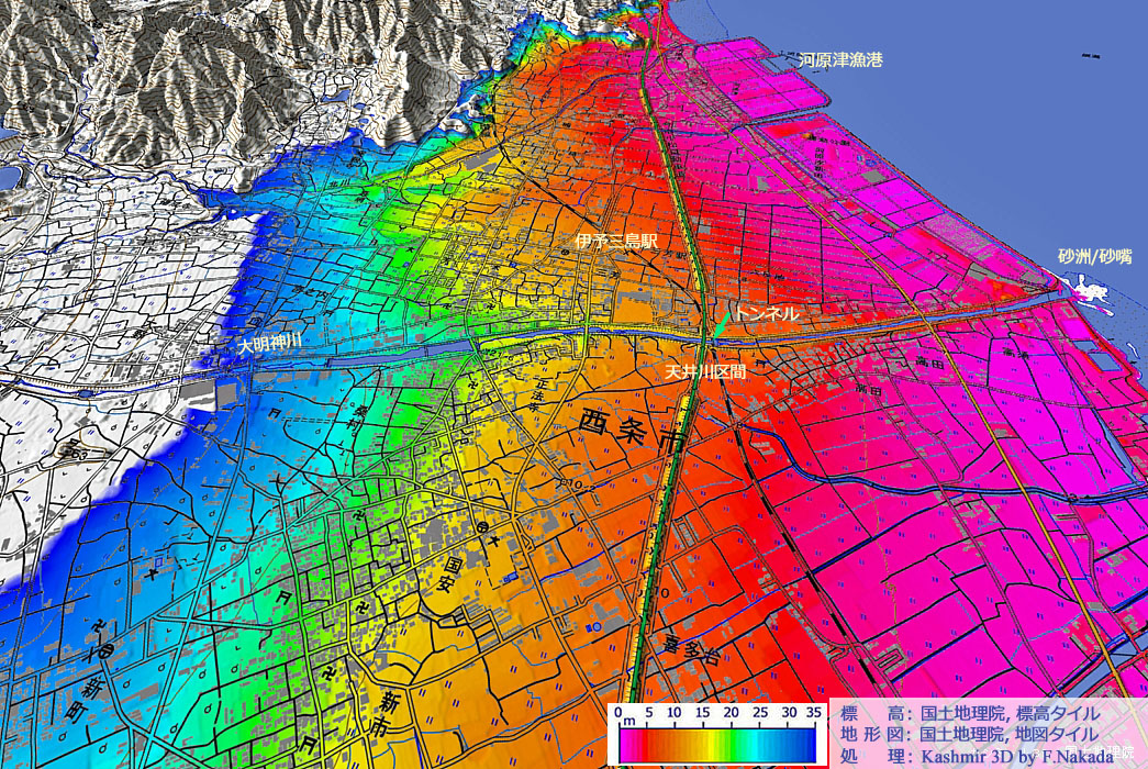 | 標高段彩図の三次元イメージ : 大明神川の天井川区間とJR予讃本線のトンネル |