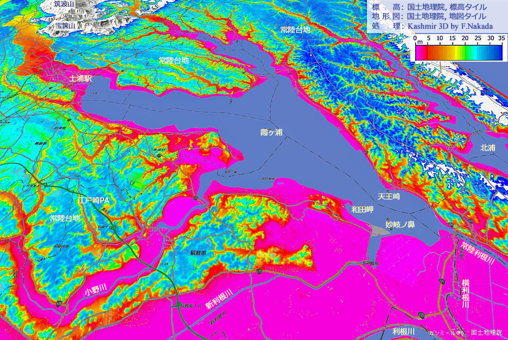 | 標高段彩図と地質図の三次元イメージ:霞ヶ浦とその周辺 |