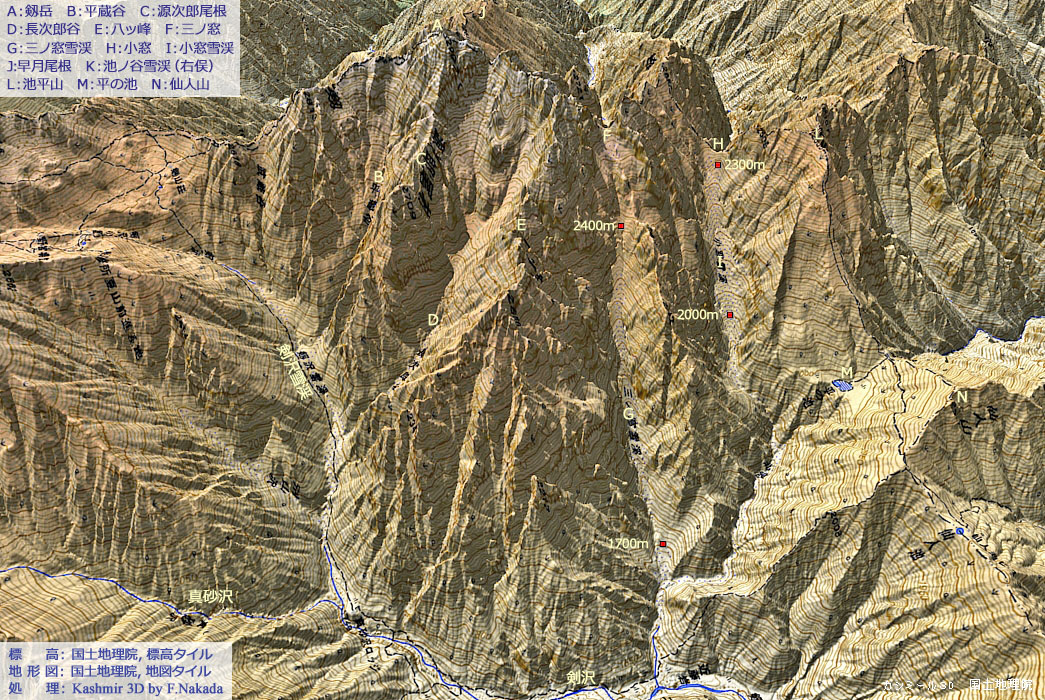 | 地形の三次元イメージ : 西側斜面の氷河地形(池ノ谷氷河) |