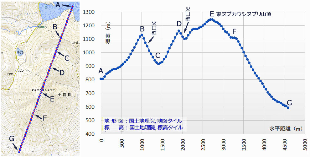 ![]() 「東ヌプカウシヌプリ」の,北北東-南南西方向の地形断面図です。 地形変換点である「B」,「D」と「E」の3つのピークは「溶岩円頂丘」でしょう。 また,「F」は,その可能性があると考えています。 なお,北側の2座(BとD)は,「火口壁」があることから,「爆発的噴火」を伴った溶岩円頂丘と考えています。 |